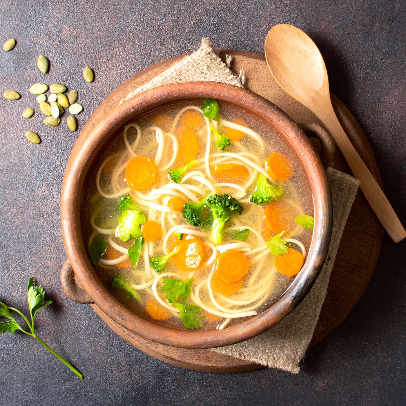 Gelatin helps support the body's production of digestive enzymes and secretes mucus to protect the lining of the stomach and small intestine. By eating gelatinous broths or soups made with gelatin, you may experience relief from indigestion, heartburn, and leaky gut symptoms. Collagen, which gelatin derives from, also helps maintain the integrity of the mucosal barrier and enhances gut healing. Some recipes include chicken stock or beef broth prepared with gelatin granules or sheets to create a more viscous and gut-healthy soup.
